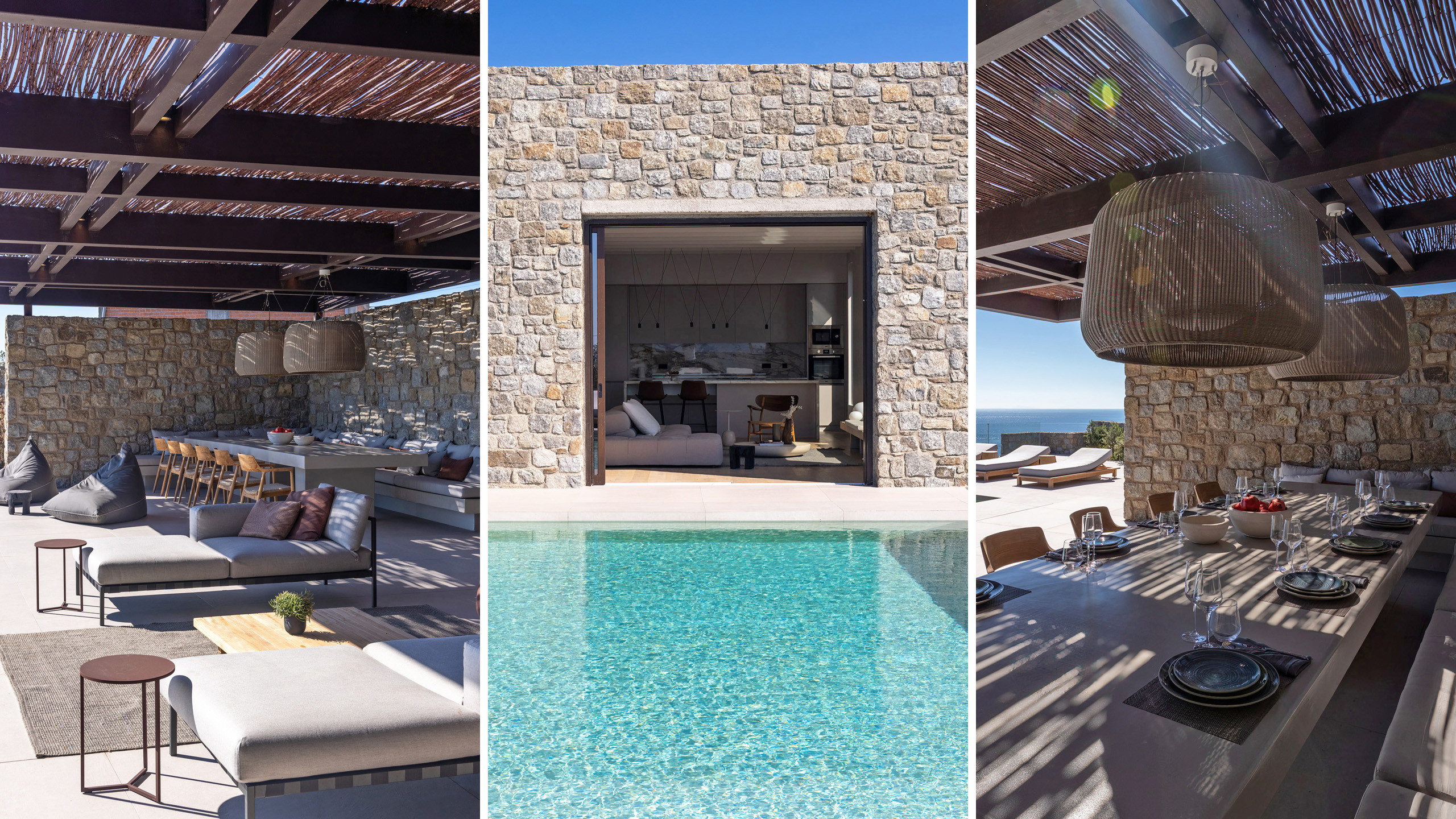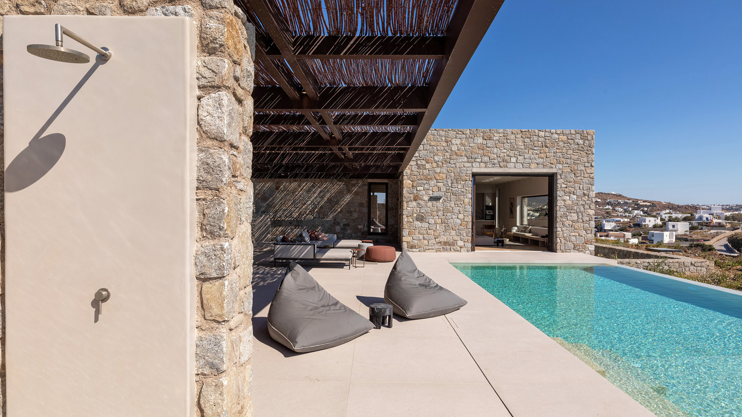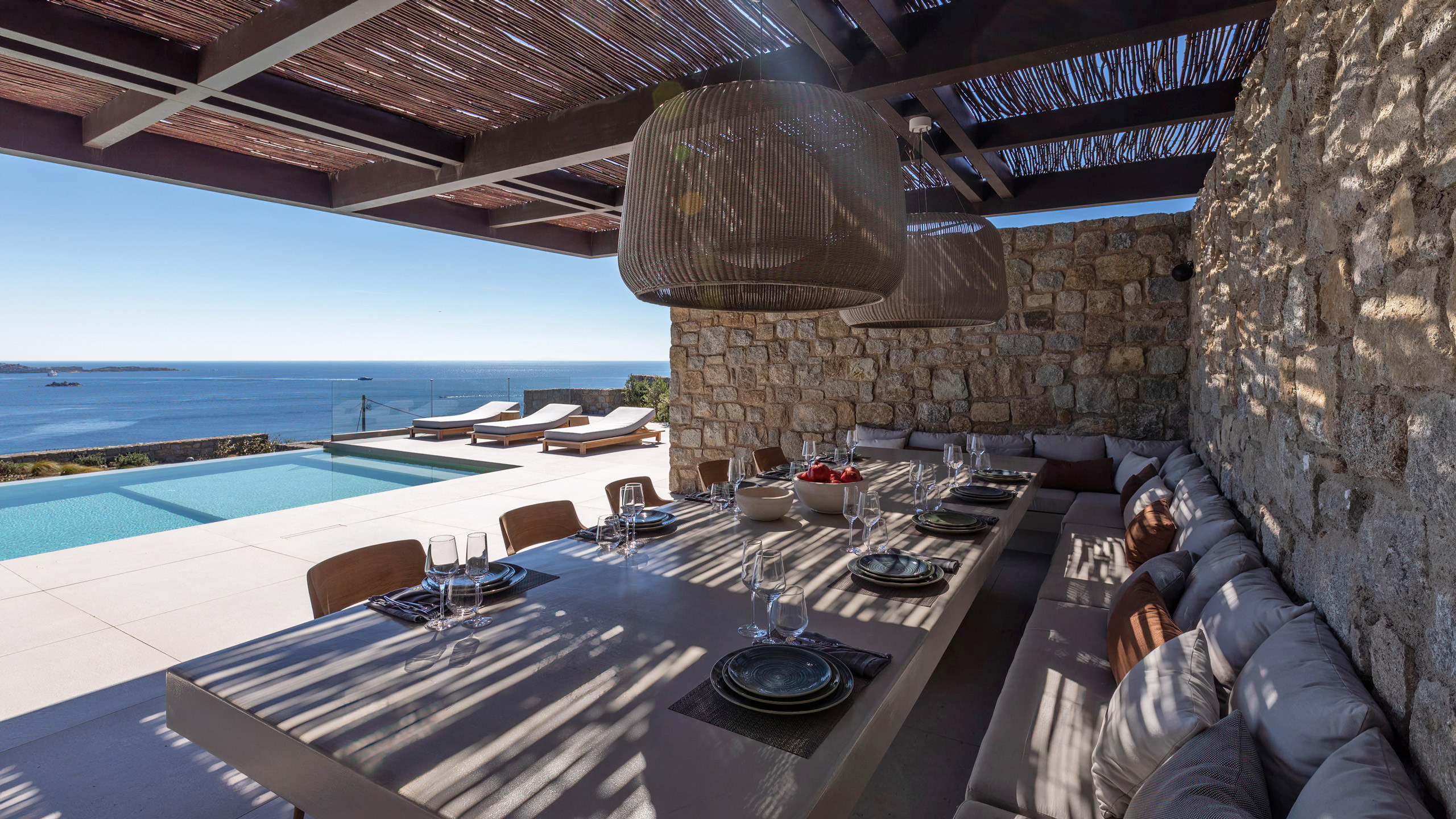 L'architettura è moderna, con le caratteristiche facciate in pietra vista e una serie di dotazioni imperdibili per il massimo comfort degli ospiti. La piscina si sviluppa su un lato dell'edificio, mentre su quello opposto trova spazio un'invitante vasca Jacuzzi, alle spalle una piacevolissima zona pranzo e diverse aree perfettamente attrezzate per il relax con divani e comode sedute sono luoghi ideali per trascorrere del tempo semplicemente sorseggiando un cocktail e ammirando il mare.