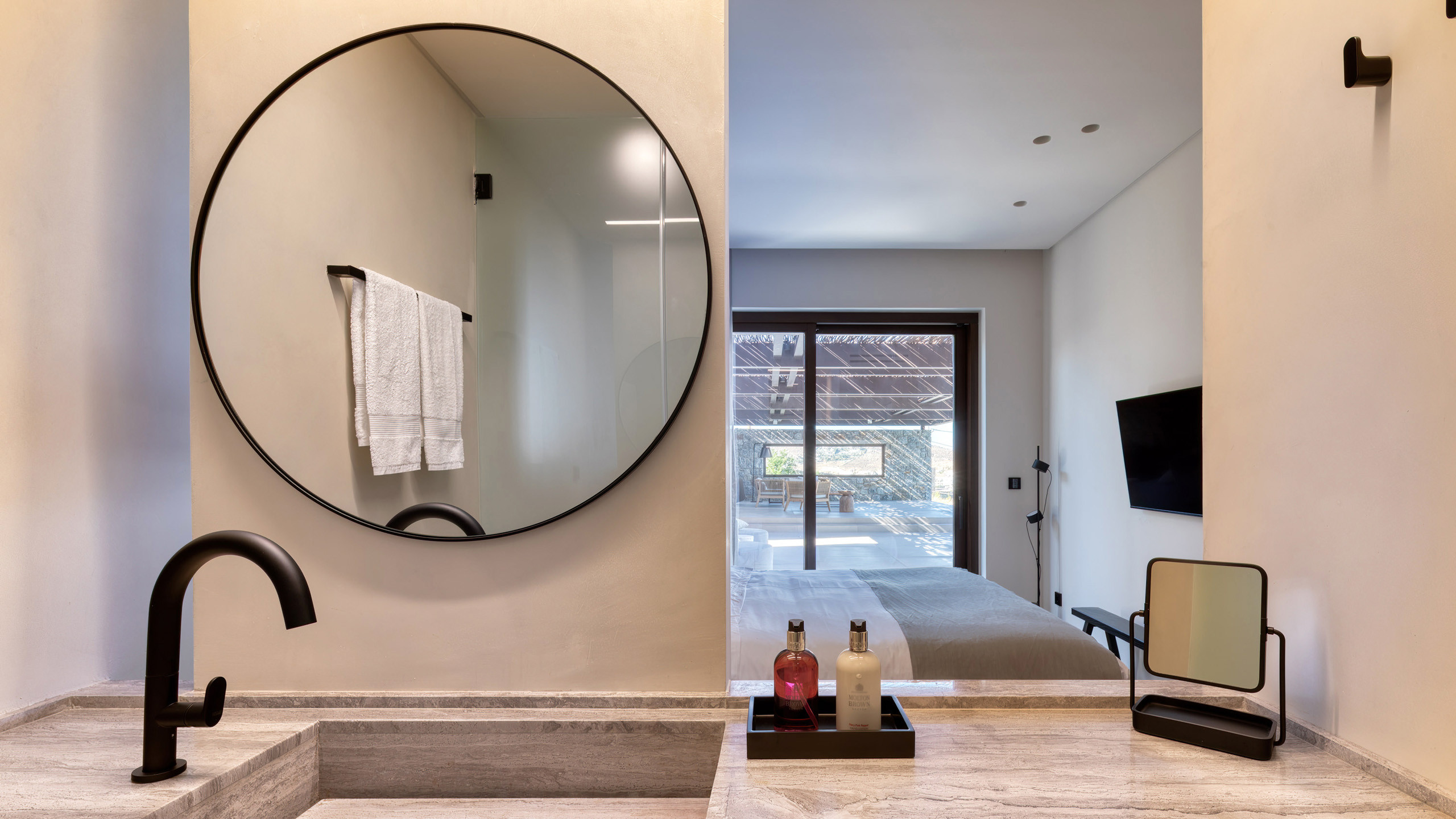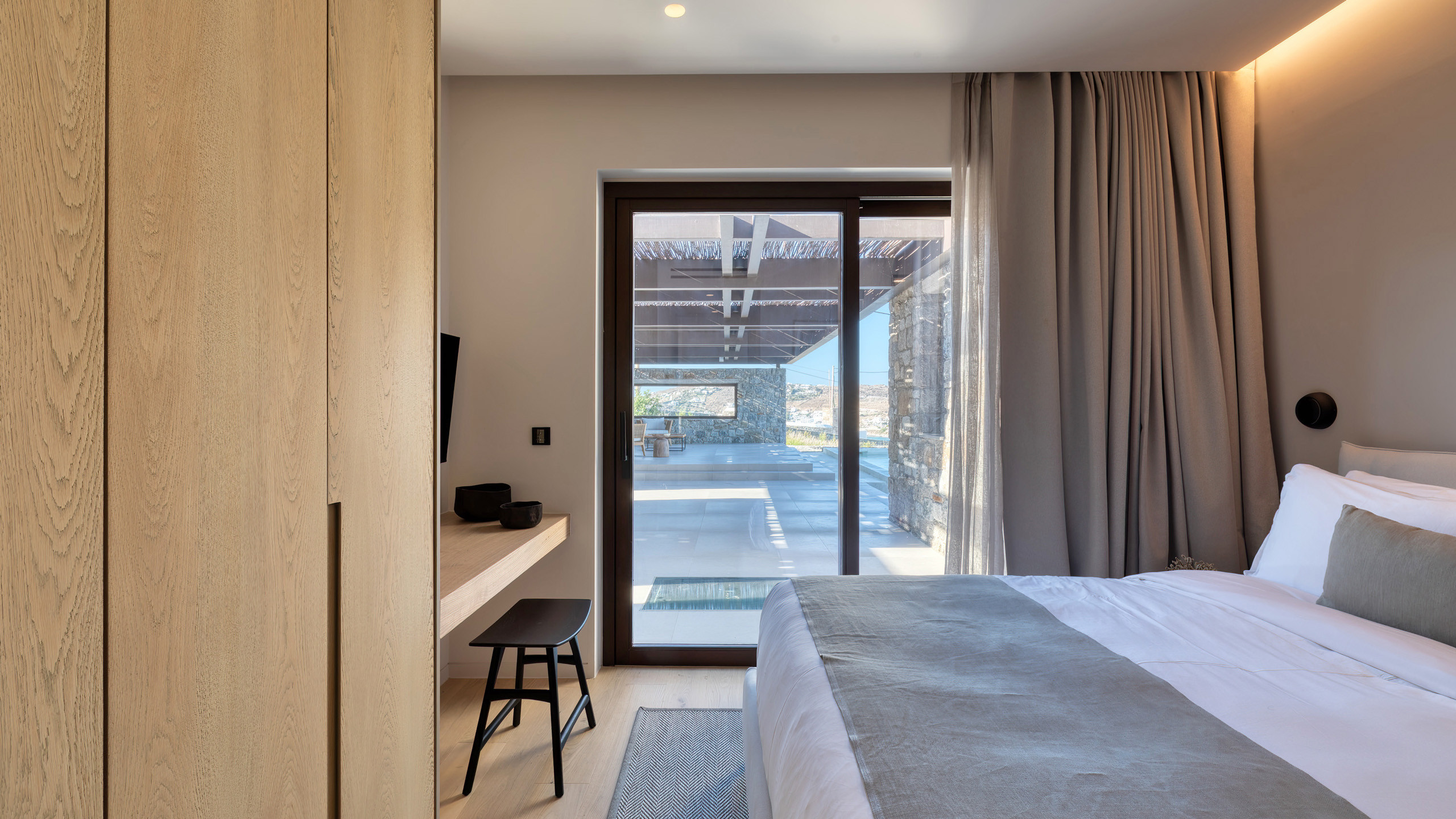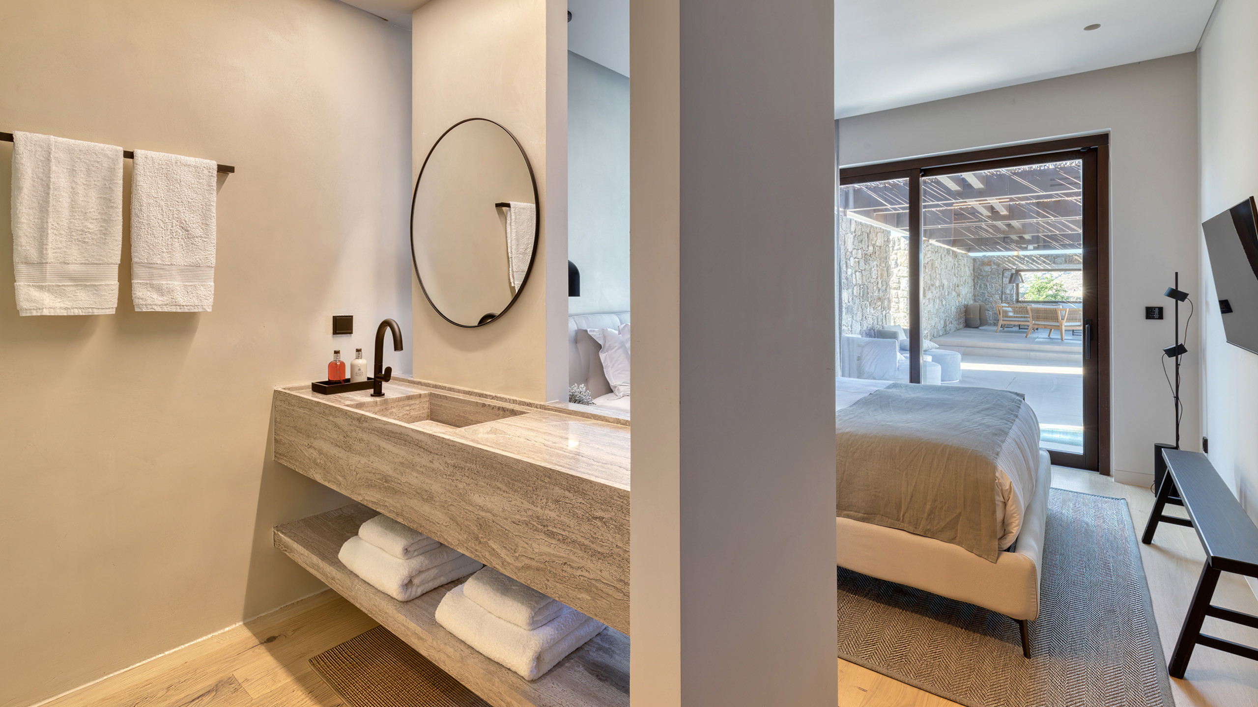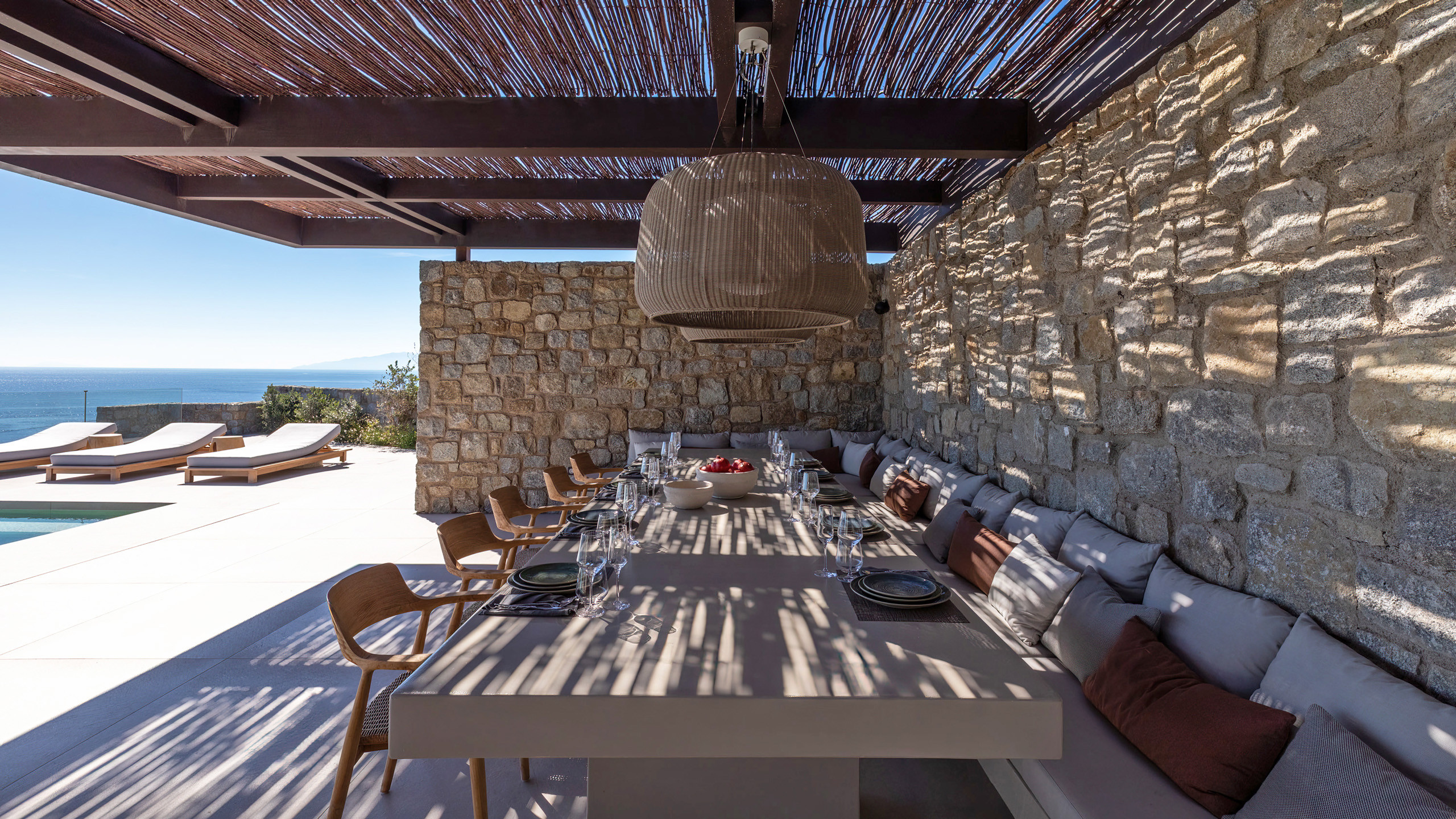 L'architettura è moderna, con le caratteristiche facciate in pietra vista e una serie di dotazioni imperdibili per il massimo comfort degli ospiti. La piscina si sviluppa su un lato dell'edificio, mentre su quello opposto trova spazio un'invitante vasca Jacuzzi, alle spalle una piacevolissima zona pranzo e diverse aree perfettamente attrezzate per il relax con divani e comode sedute sono luoghi ideali per trascorrere del tempo semplicemente sorseggiando un cocktail e ammirando il mare.
