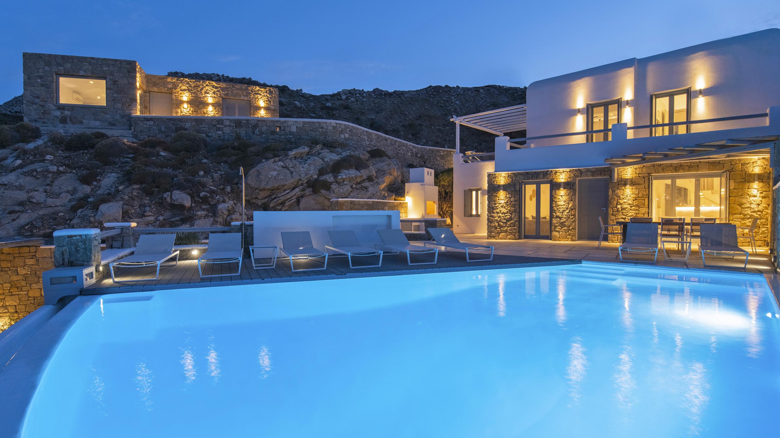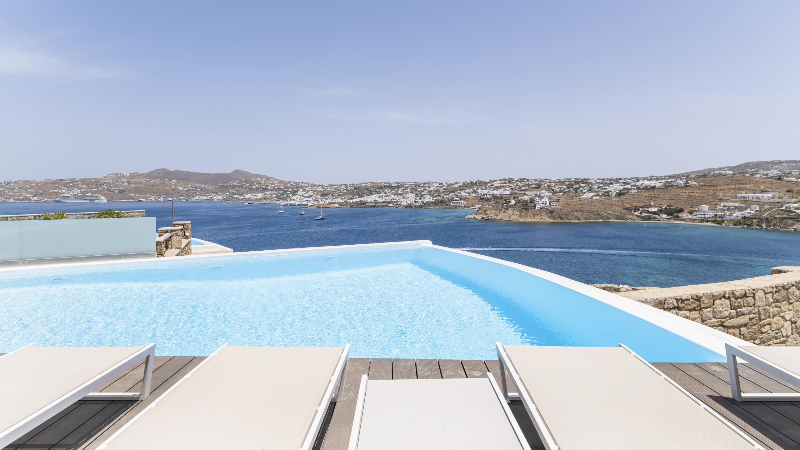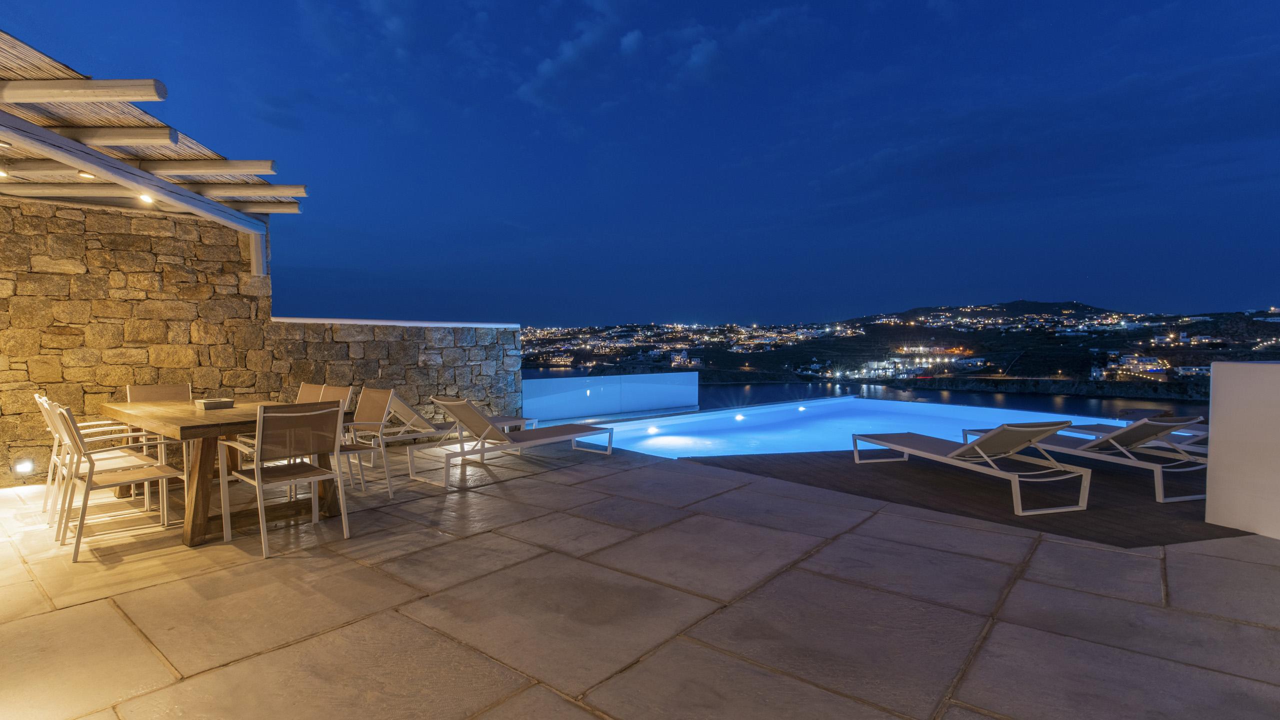 La terrazza principale della proprietà è orientata in modo da trarre il maggior beneficio possibile dalla splendida vista. La piscina privata trova spazio nella posizione più panoramica possibile, circondata da cuscini e lettini prendisole per il massimo comfort degli ospiti. Zona pranzo e angolo bar sono a disposizione a breve distanza, ideali per rilassarsi in compagnia.
