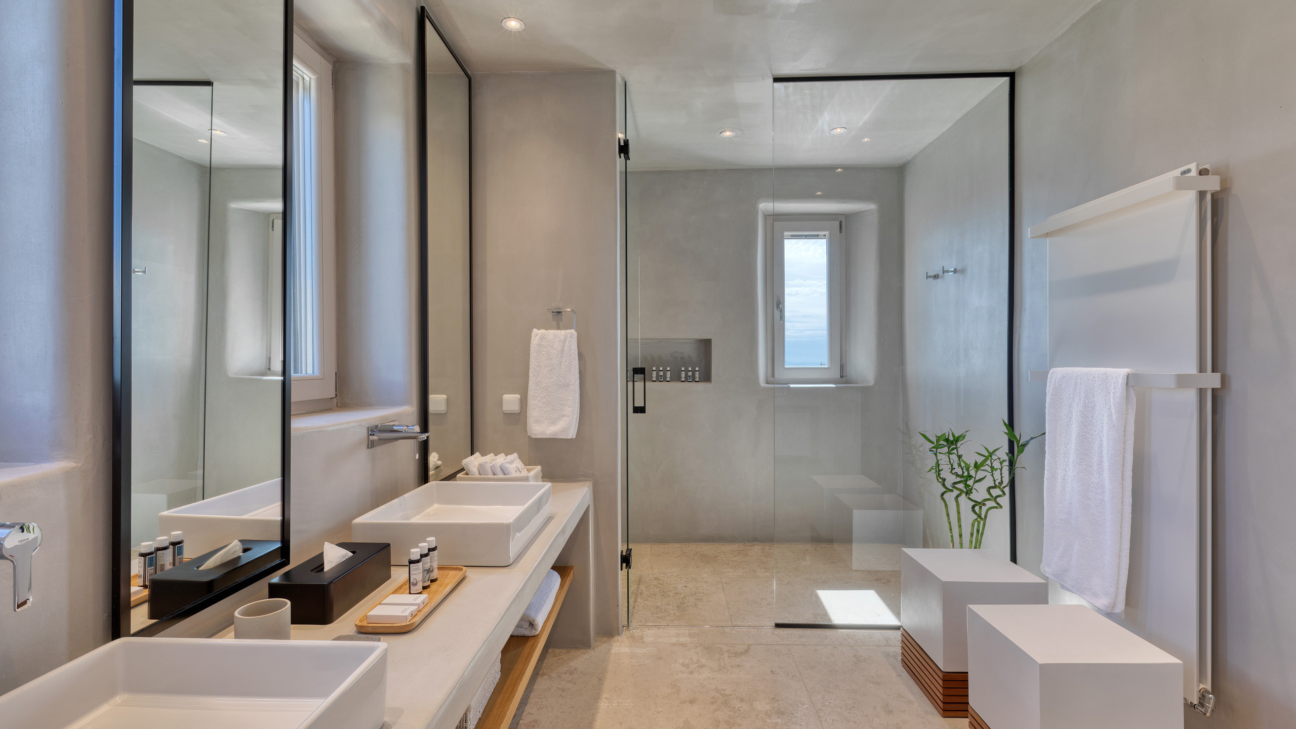 All’interno si respira un’atmosfera ariosa ed elegante, i colori predominanti sono il bianco e le sue sfumature, tutti gli ambienti si distinguono per un gusto squisito senza sterili eccessi, mantenendo tuttavia le prerogative e le dotazioni che ci si possano aspettare da una residenza di questo livello.
