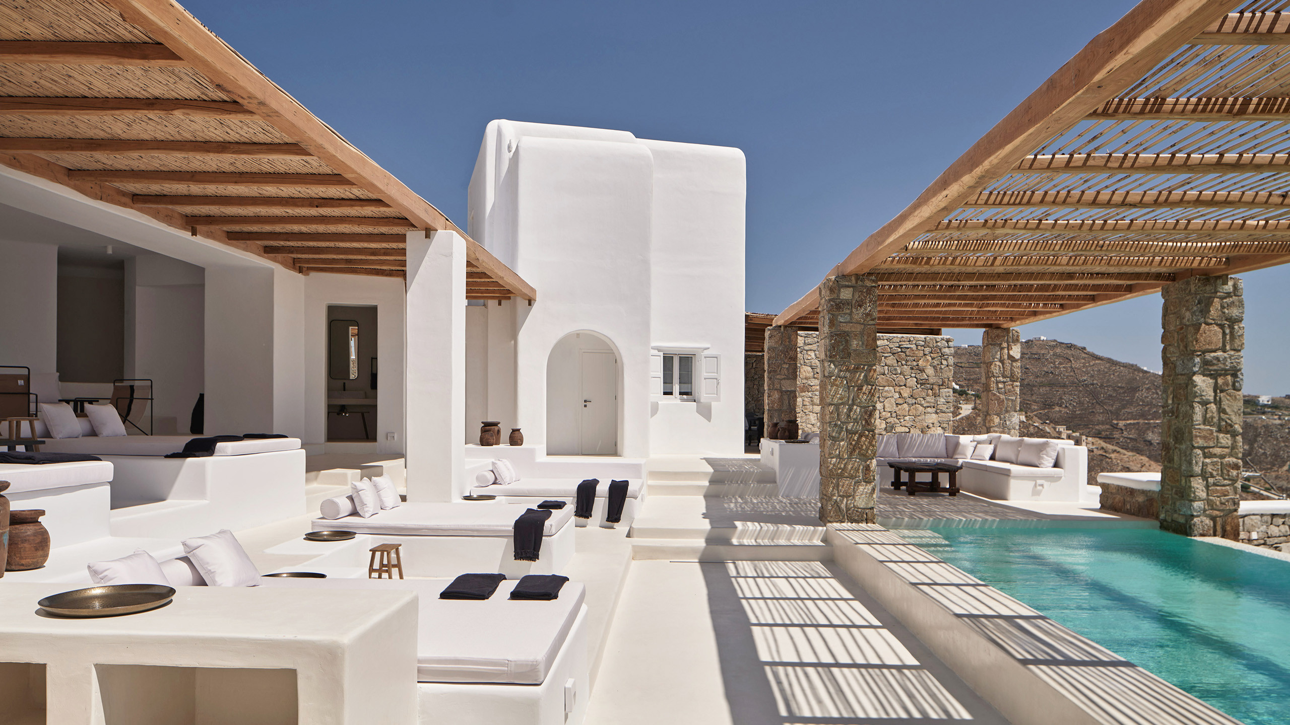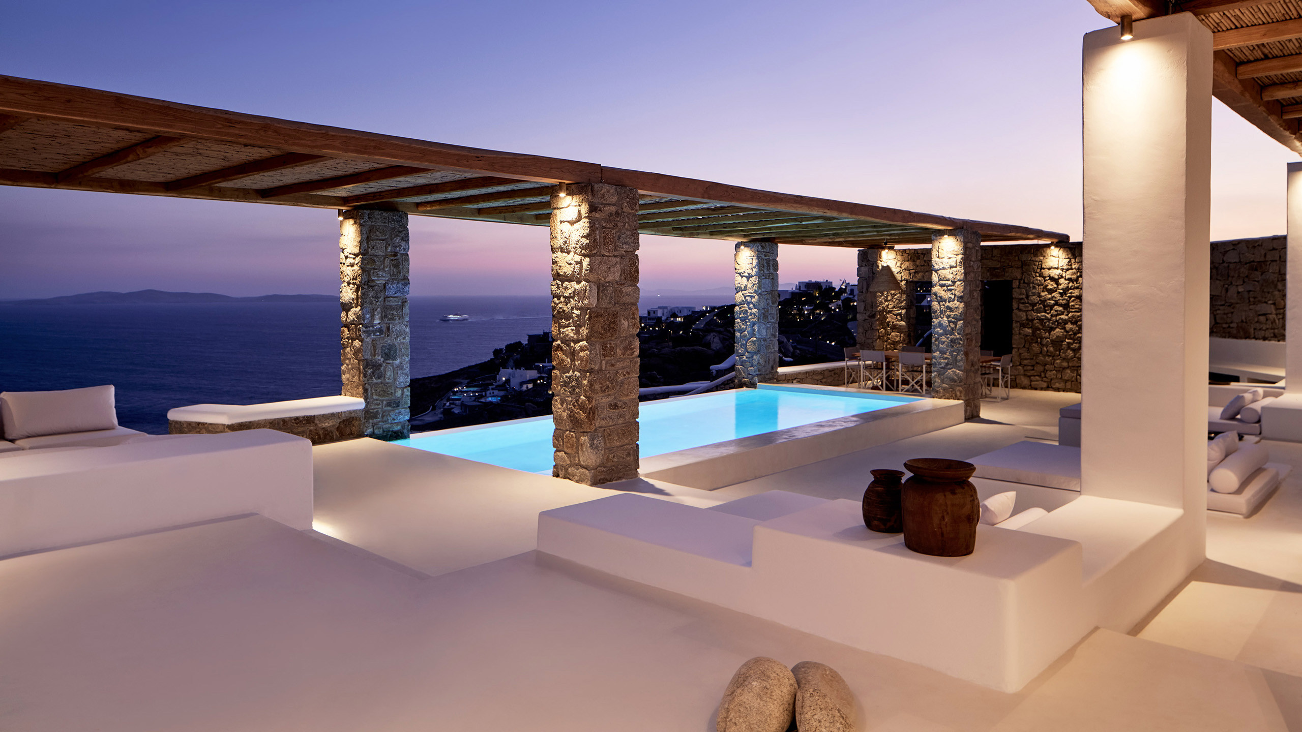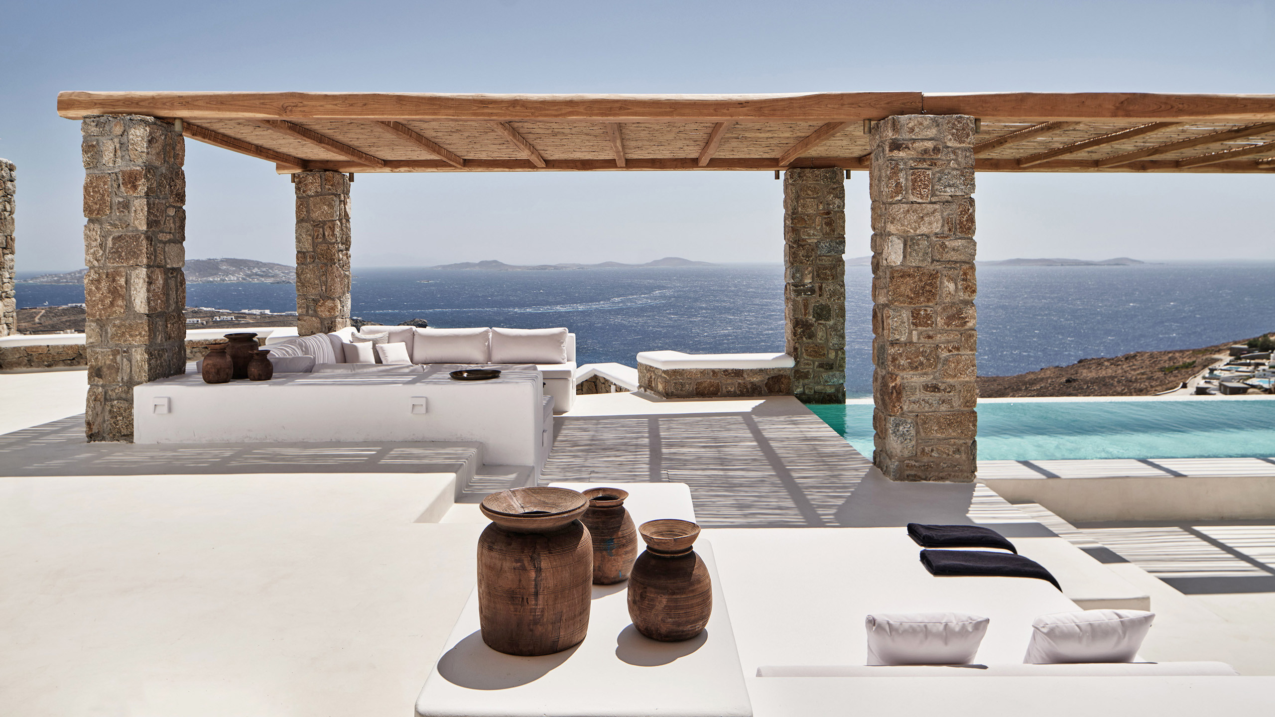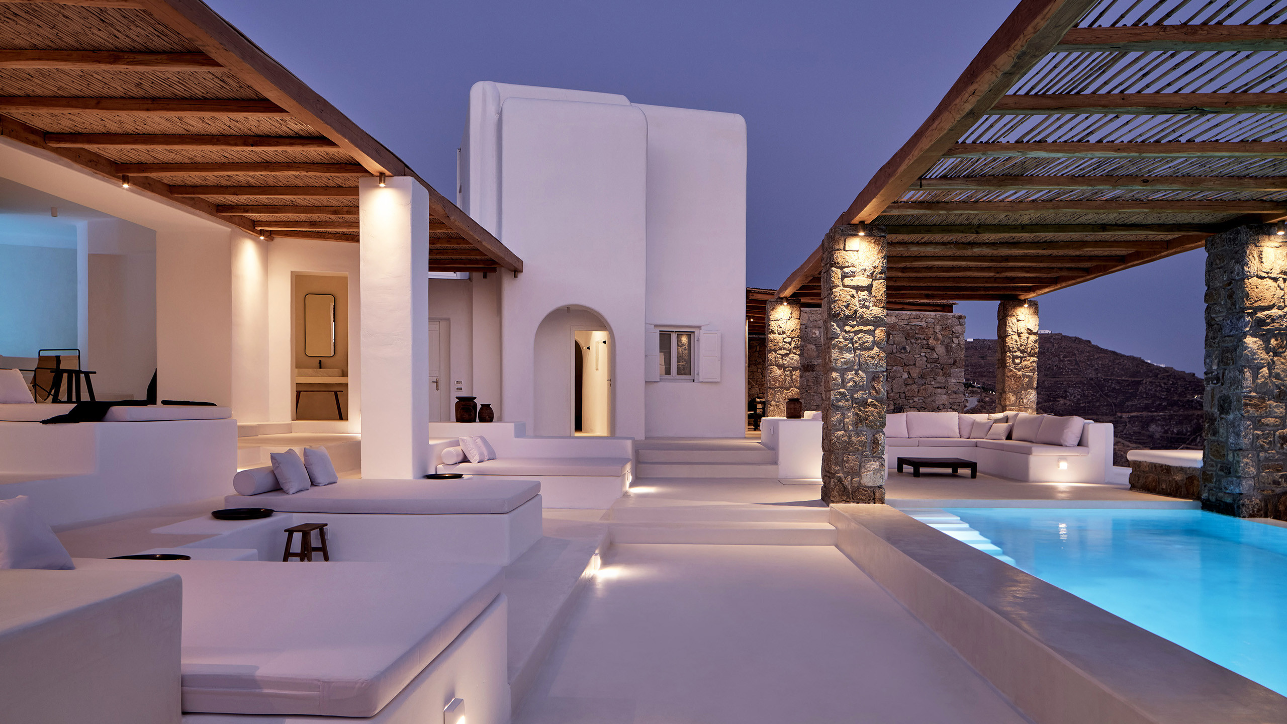 In perfetto stile Cicladico questa villa si divide su tre livelli, con quello principale che vede la presenza della piscina privata e di una intrigante terrazza disseminata di una moltitudine di angoli e nicchie ben arredati per il comfort degli ospiti. E' senza dubbio questo il punto focale della proprietà, in un ambiente chic e minimalista, con il bianco a farla da padrone e pochi interessanti elementi d'arredo disposti con cura. Immancabile la zona pranzo all'ombra di una pergola, il tutto con la costante splendida vista del mare ad accompagnare e ad impreziosire la situazione.