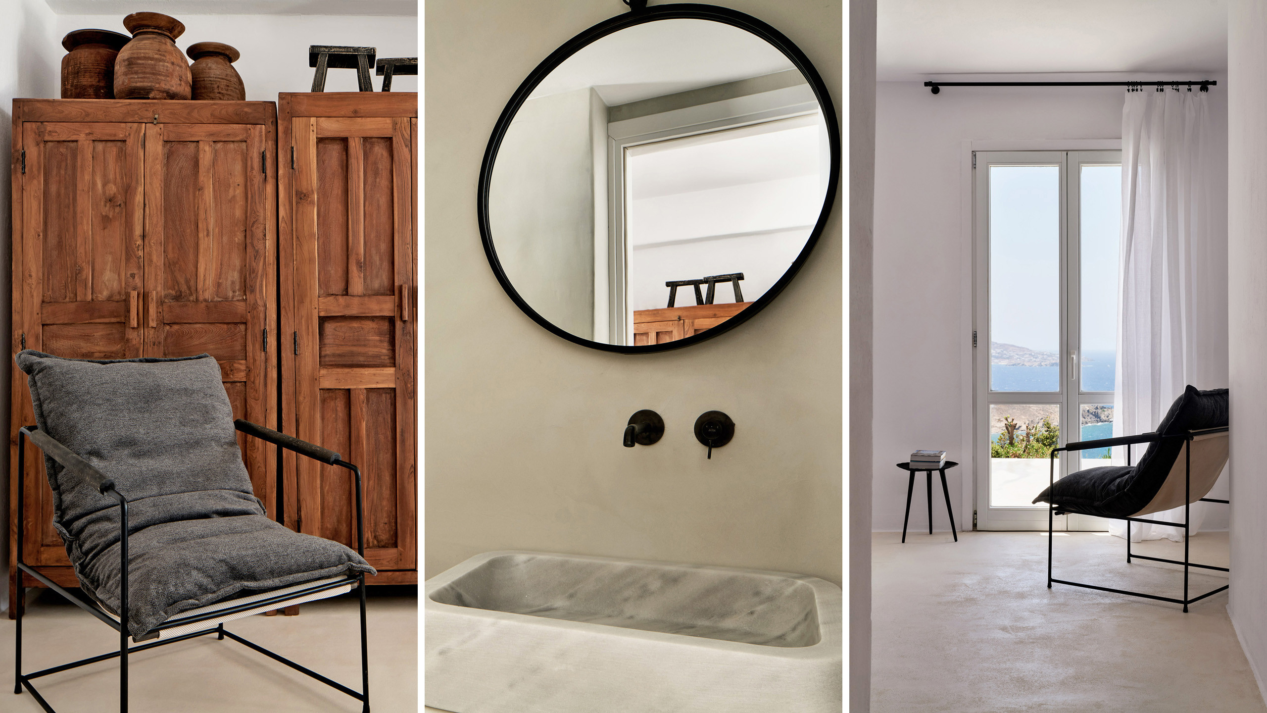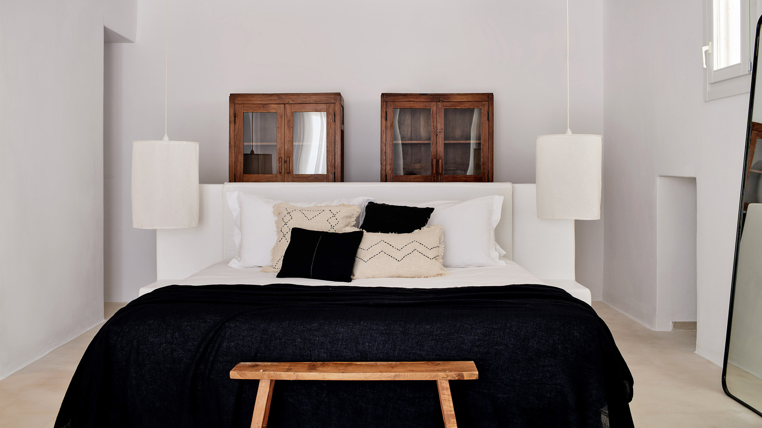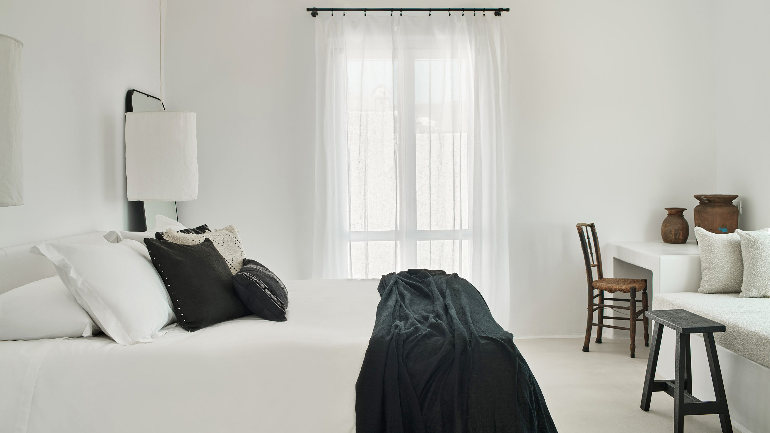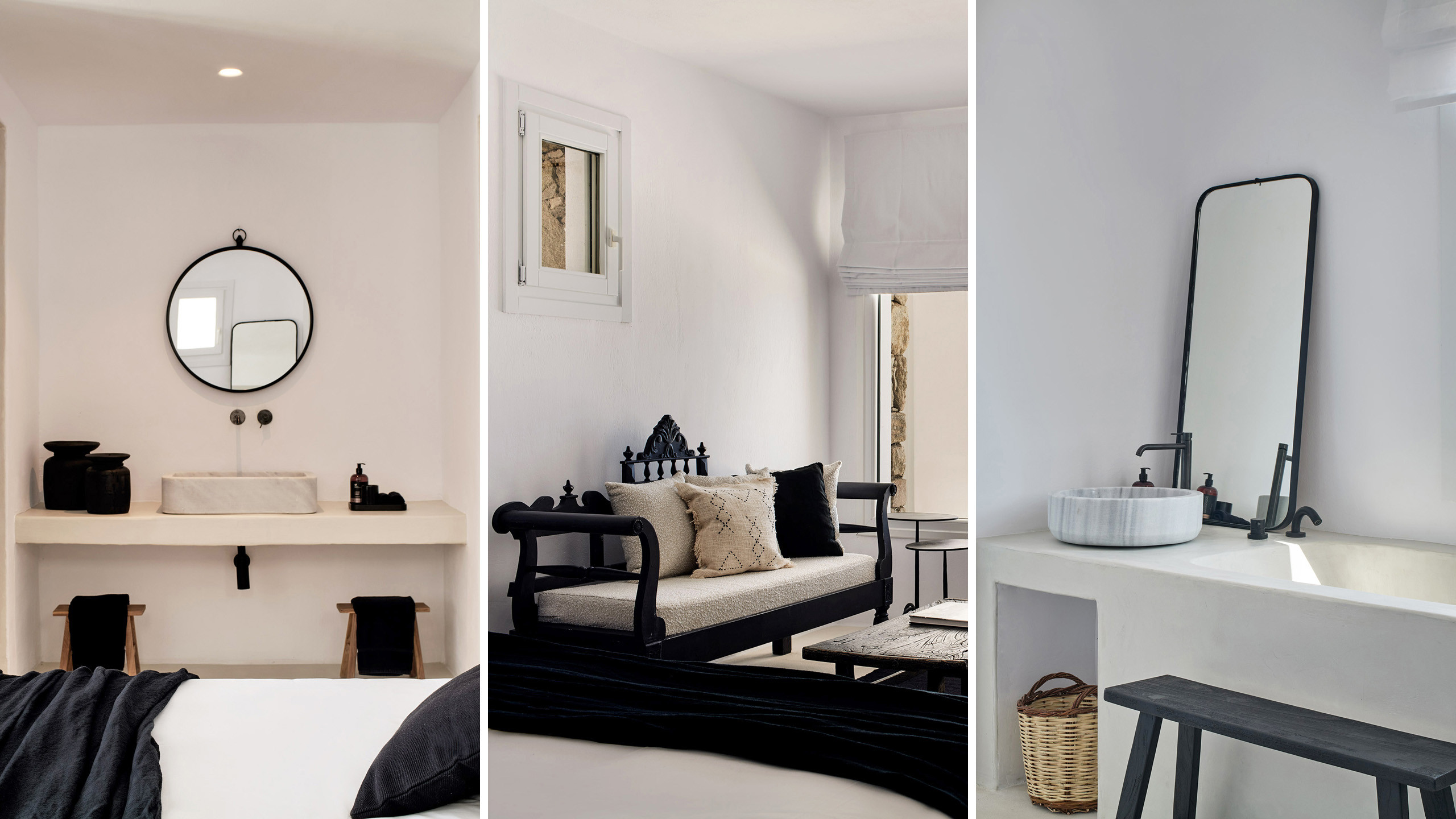 Gli interni di Sunset Corner seguono in maniera coerente lo stile visto all'esterno, l'abitazione è stata completamente ristrutturata e rinnovata, preservando però le caratteristiche e alcuni degli elementi tradizionali, per un risultato finale fresco e sofisticato. Le zone comuni sono collegate naturalmente all'esterno, e tutte le camere godono di una bella vista mare, alcune delle quali con accesso diretto verso il godibile giardino sul livello più basso. Tutti gli ambienti rispettano lo stesso filo conduttore e l'approccio minimalista dell'intera proprietà, con pochi ed azzeccati tocchi di design ed elementi rigorosamente neri a contrastare il bianco dominante.