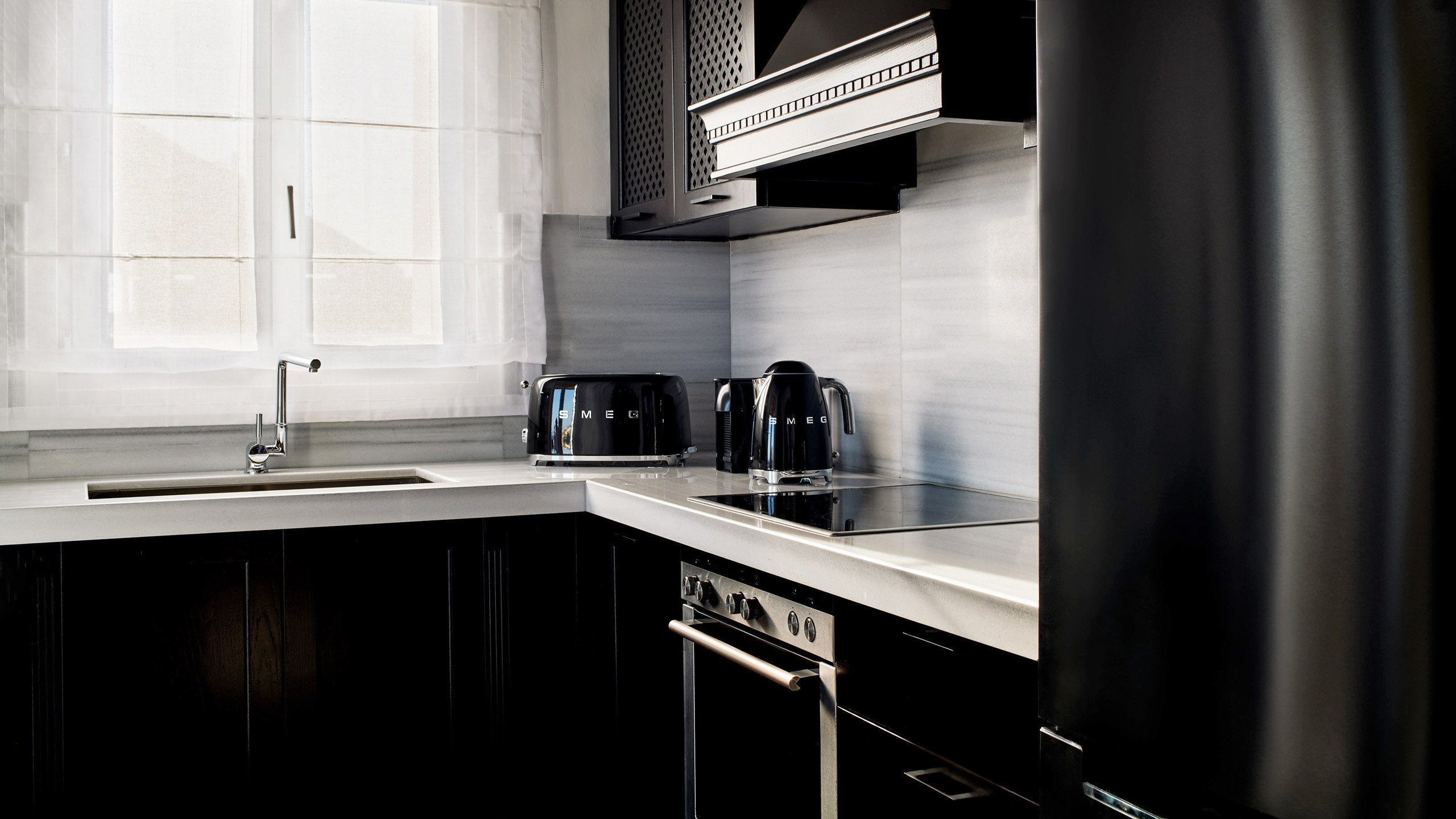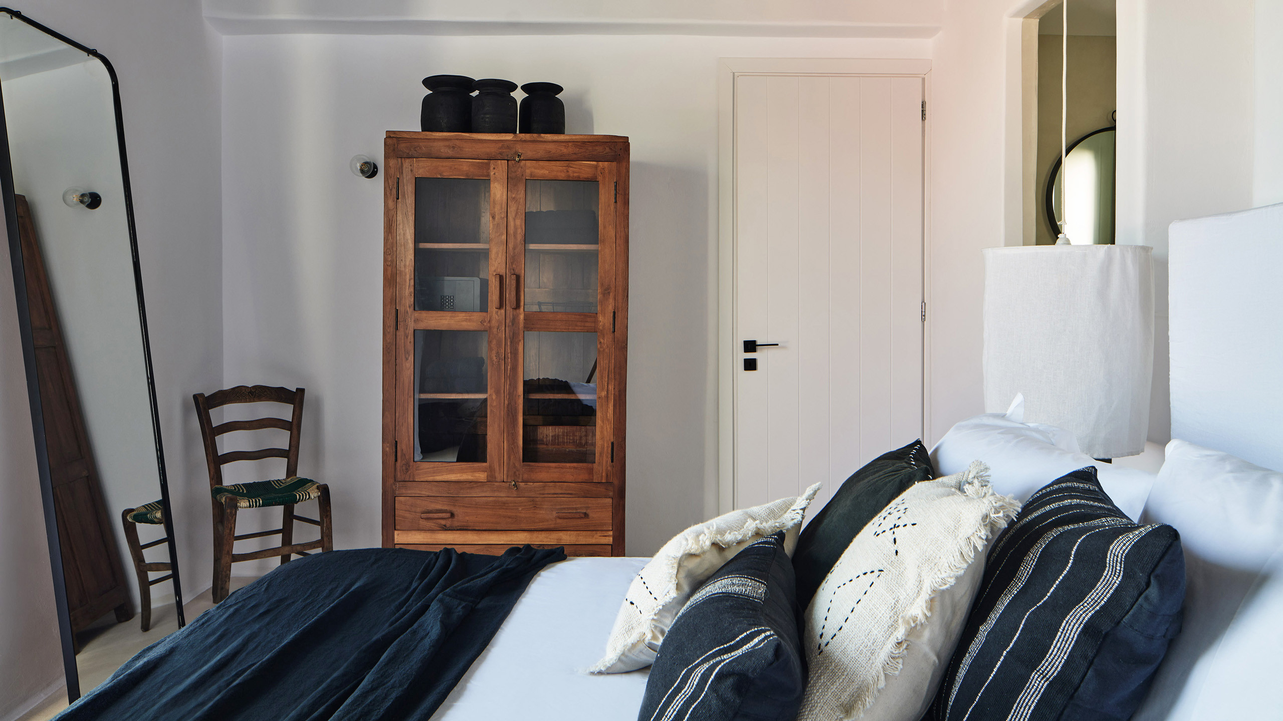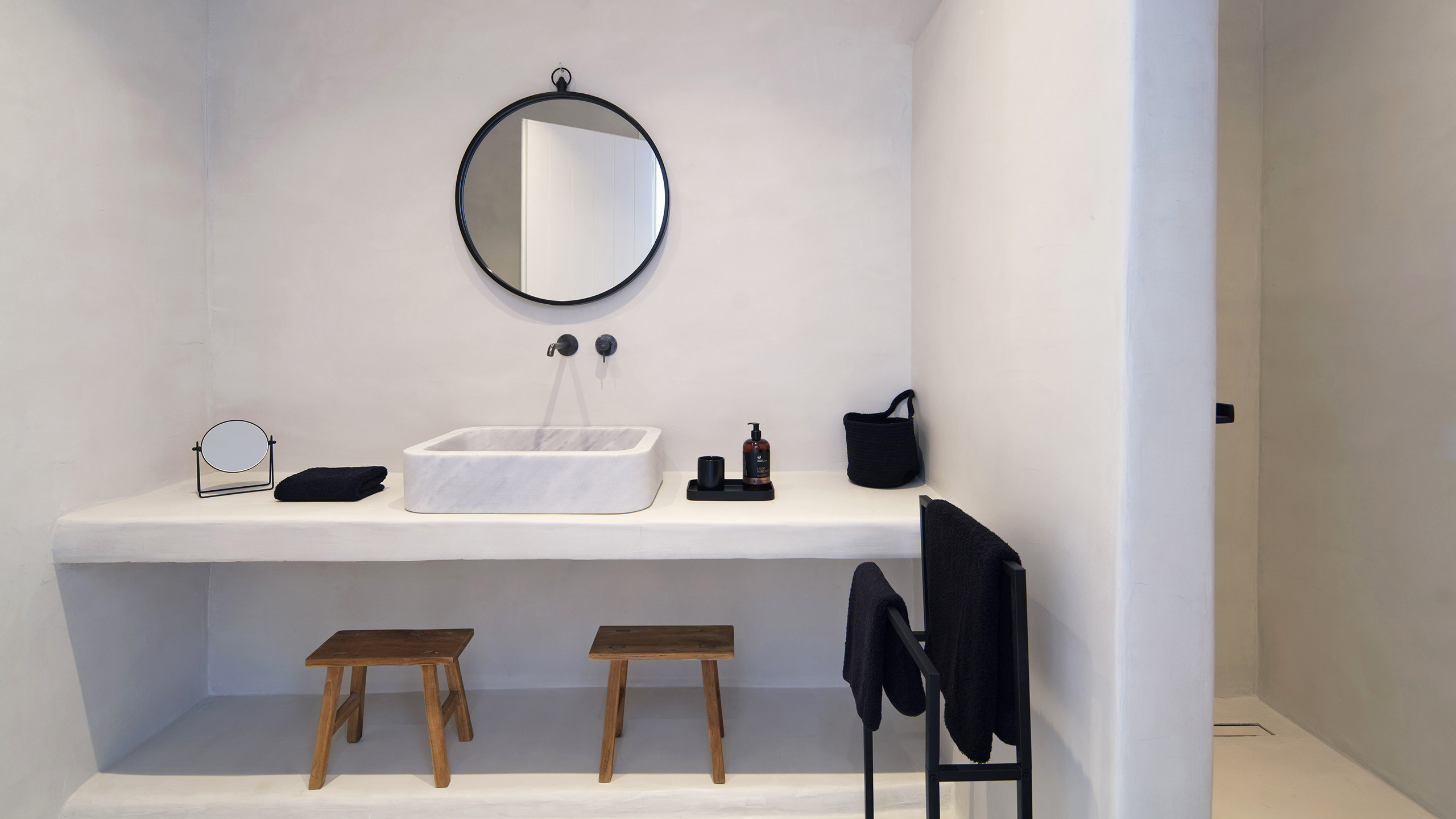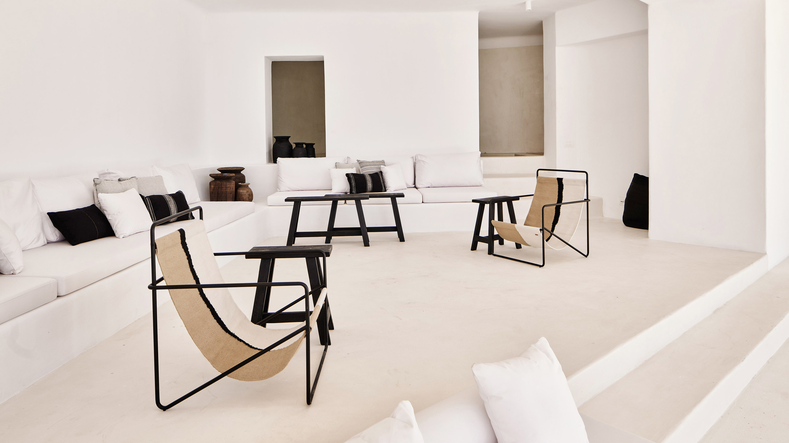 Gli interni di Sunset Corner seguono in maniera coerente lo stile visto all'esterno, l'abitazione è stata completamente ristrutturata e rinnovata, preservando però le caratteristiche e alcuni degli elementi tradizionali, per un risultato finale fresco e sofisticato. Le zone comuni sono collegate naturalmente all'esterno, e tutte le camere godono di una bella vista mare, alcune delle quali con accesso diretto verso il godibile giardino sul livello più basso. Tutti gli ambienti rispettano lo stesso filo conduttore e l'approccio minimalista dell'intera proprietà, con pochi ed azzeccati tocchi di design ed elementi rigorosamente neri a contrastare il bianco dominante.